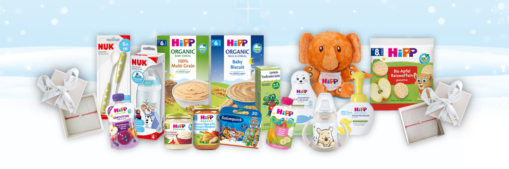 1 x HiPP ORGANIC Biscuitul Copilului (180 g, de la 6 luni) + HiPP Măr-Mango cu Piersică (100 g, de la 1 an) + 1 x HiPP ORGANIC Rondele de Orez cu Măr (30 g, de la 8 luni) + 1 x HiPP Babysanft Spumă spălare (250 ml) + 1 x HiPP Memo Game