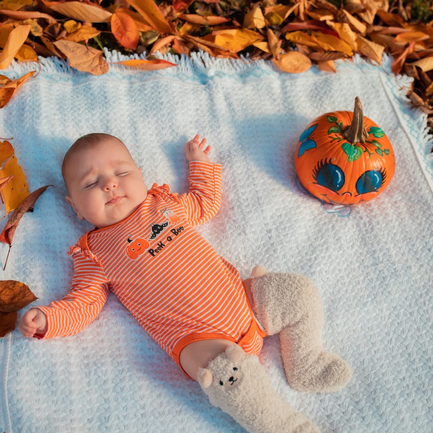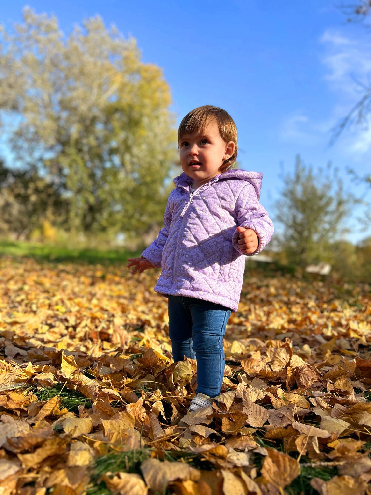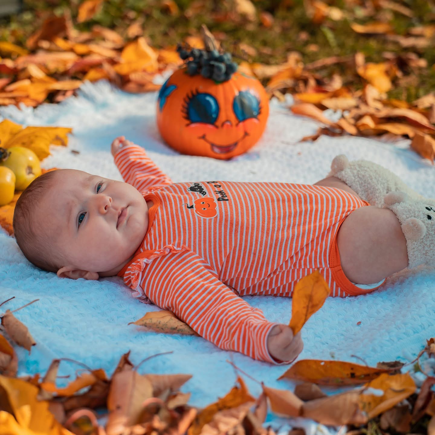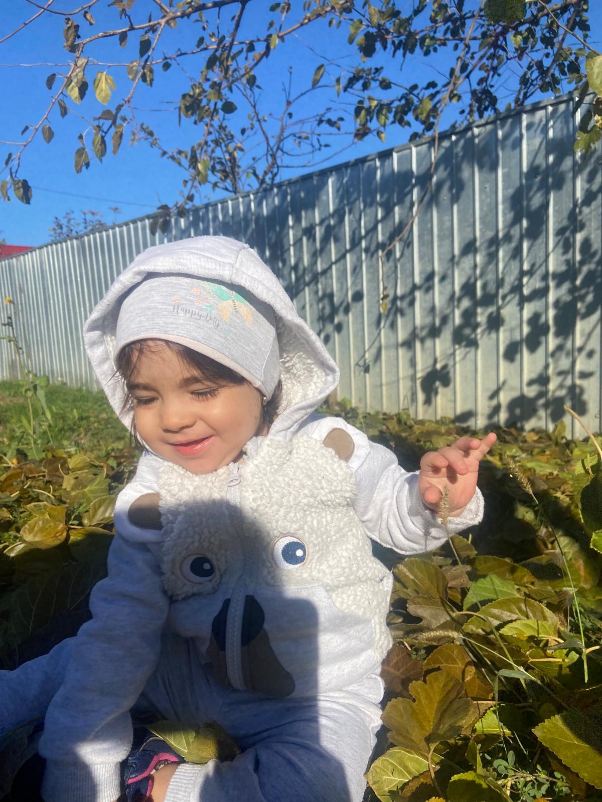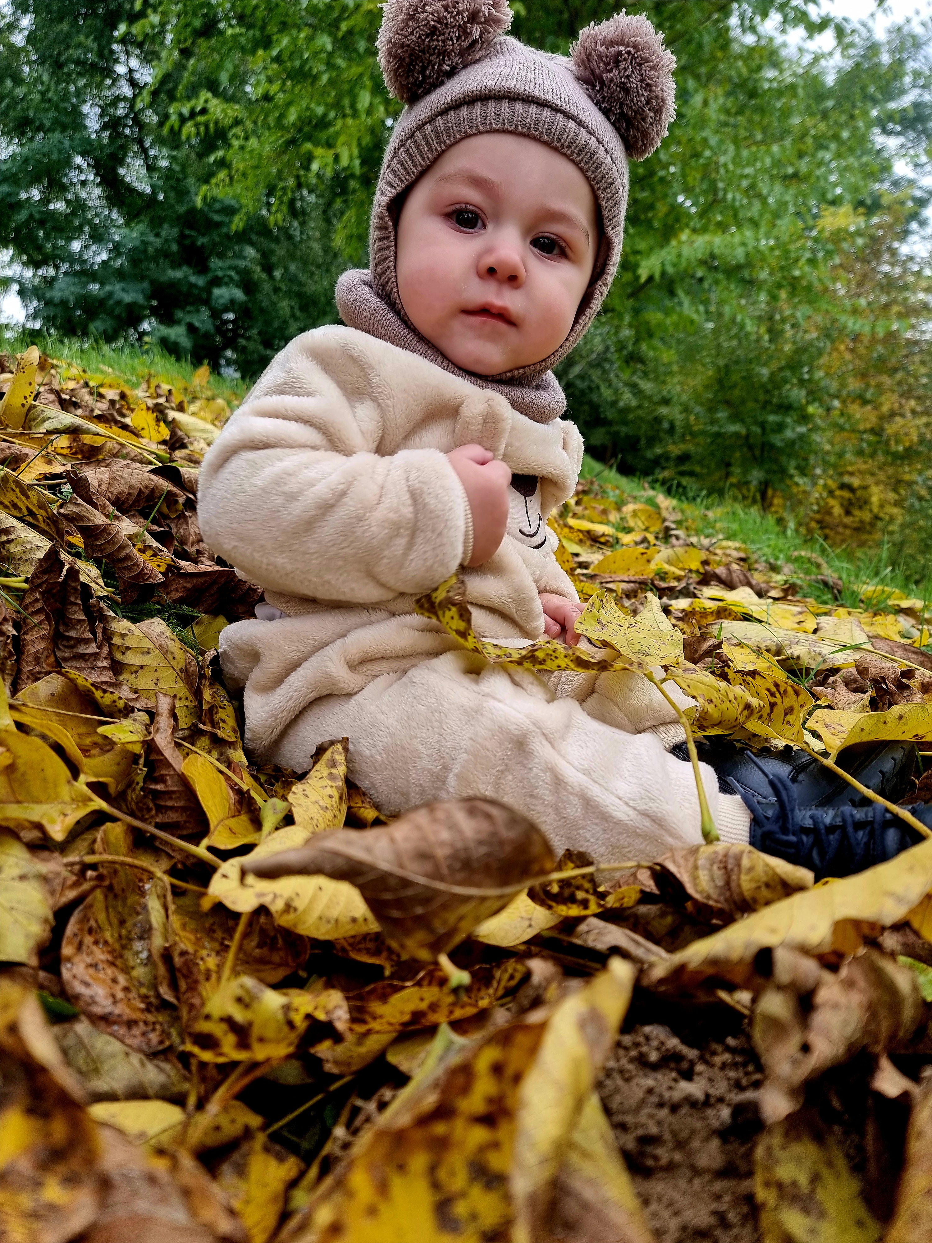 Toamna are o prințesă: Eva, cu frunze-n jur și un dovlecel zâmbăreț.🤭