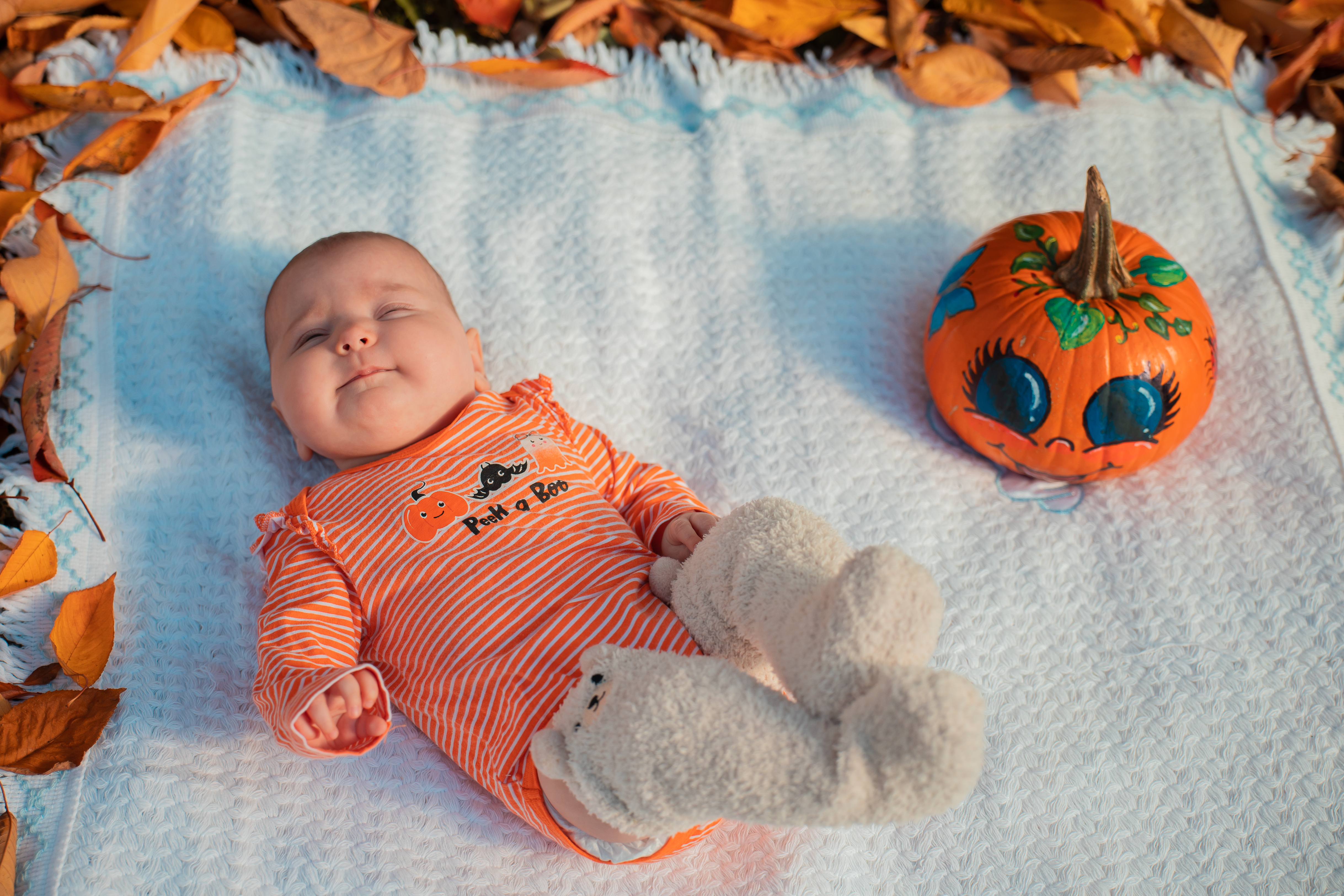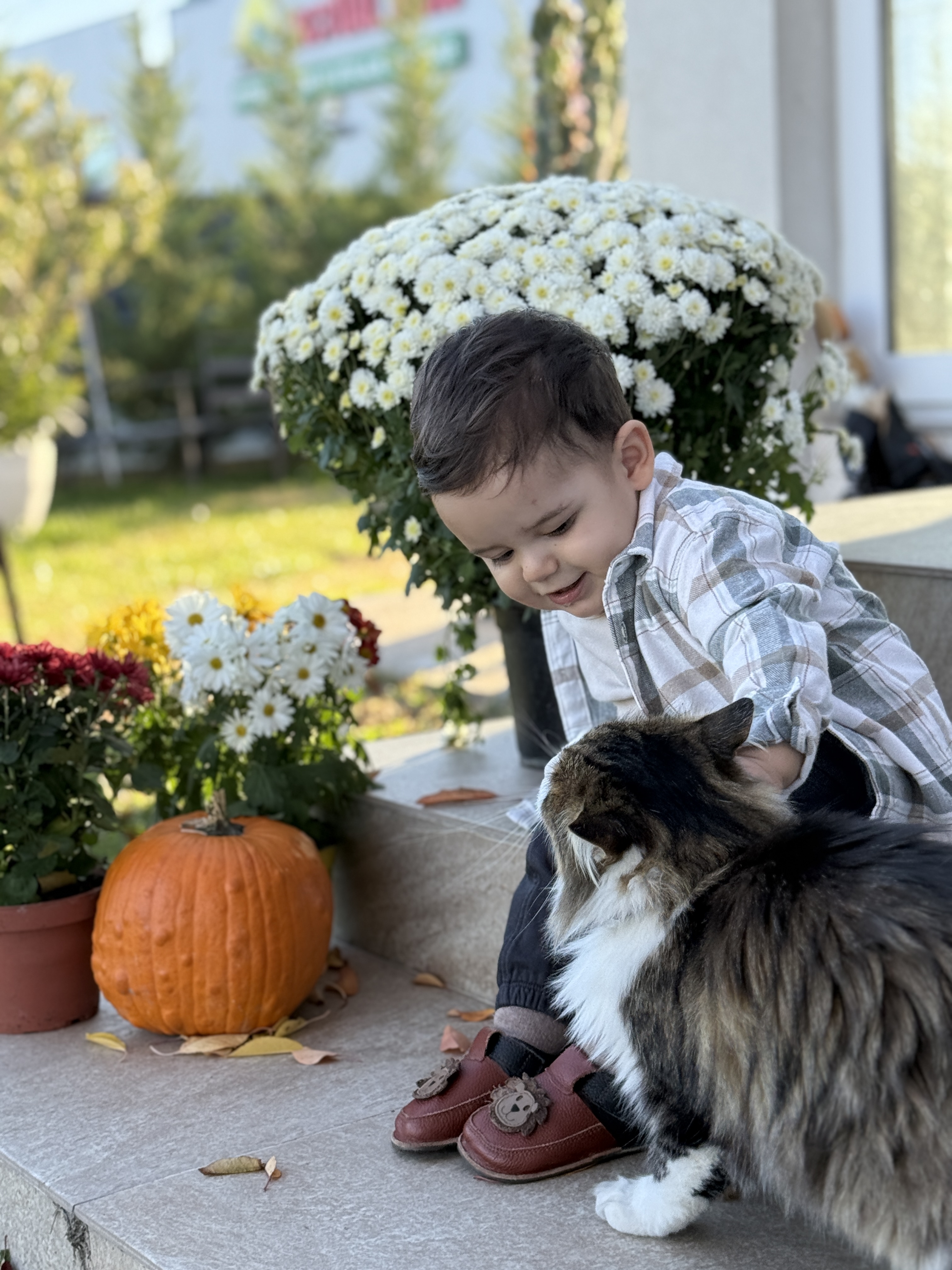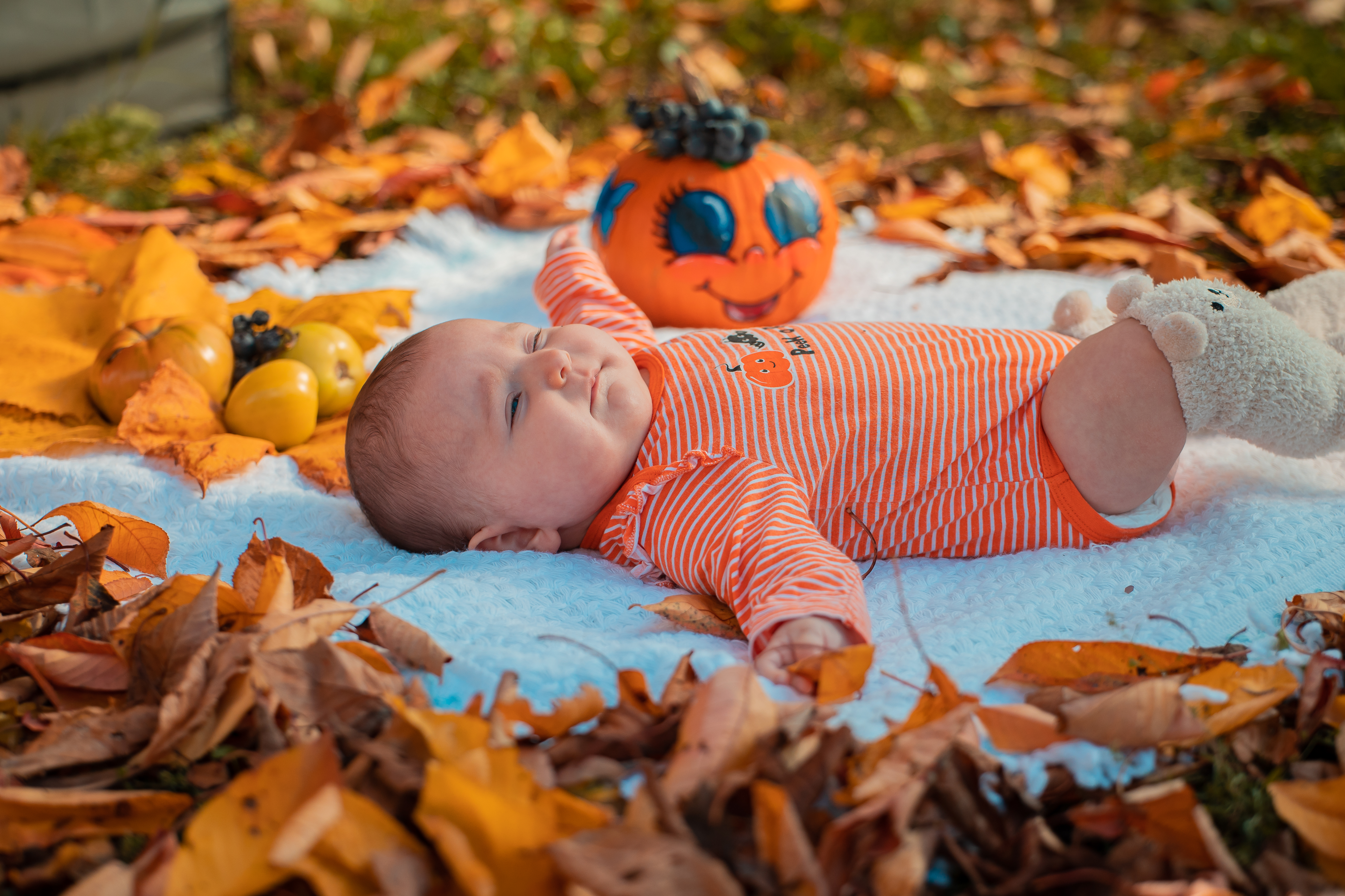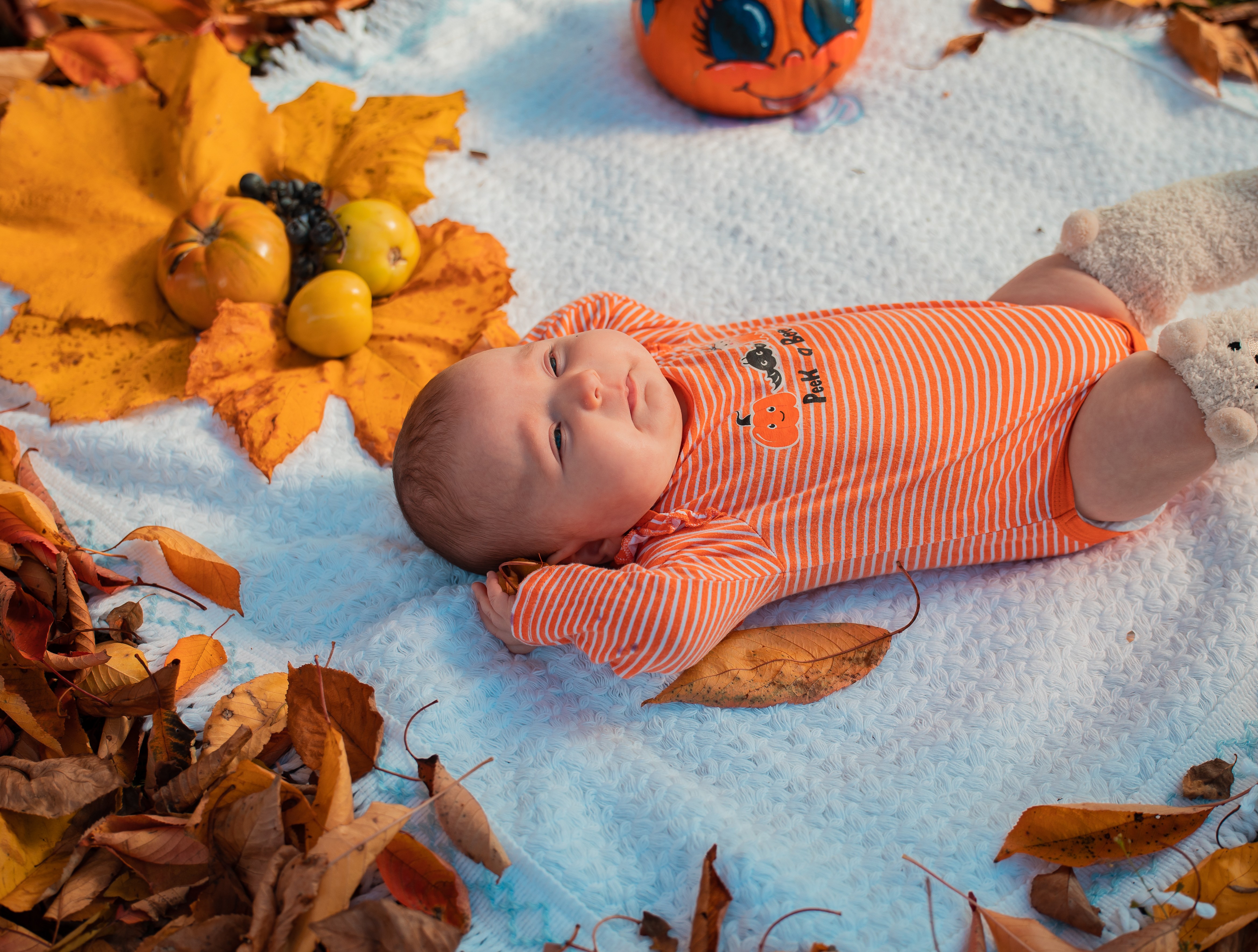 Toamna are o prințesă: Eva, cu frunze-n jur și un dovlecel zâmbăreț.🤭